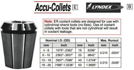 Note ER coolant collets are designed for use with cylindrical shank tools (no flats). Use of coolant collets with tools that are not cylindrical will result in coolant leakage.