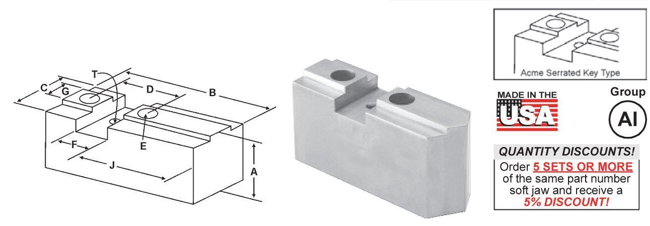 | Group No. | Chuck Size | Tap Hole T | Groove Width G | Key Width F | Screw Size E | Hole Space D | Hght Inch A | Key to Front J | Width Inch C | Length Inch B | POINTED END Part Number | POINTED END Part Number |