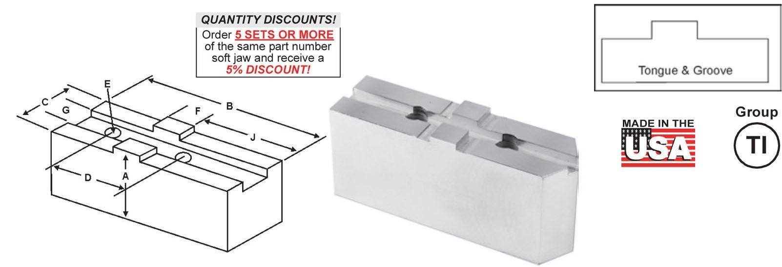 | Group No | Chuck Size | Type | Groove Width G | Tongue Width F | Screw Size E | Hole Space D | Height Inch A | Tongue to Front J | Tongue Position | Length Inch B | Width Inch C | POINTED END Part Number | POINTED END Part Number |
