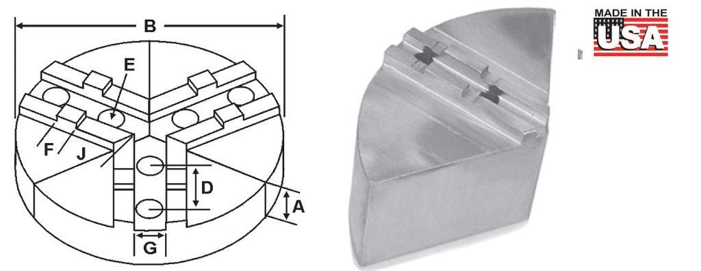 | Group No. | Chuck Size | Groove Width G | Tongue Width F | Screw Size E | Hole Space D | Tongue to Front J | Pie Dia B | Hght Inch A | Part Number | Part Number |