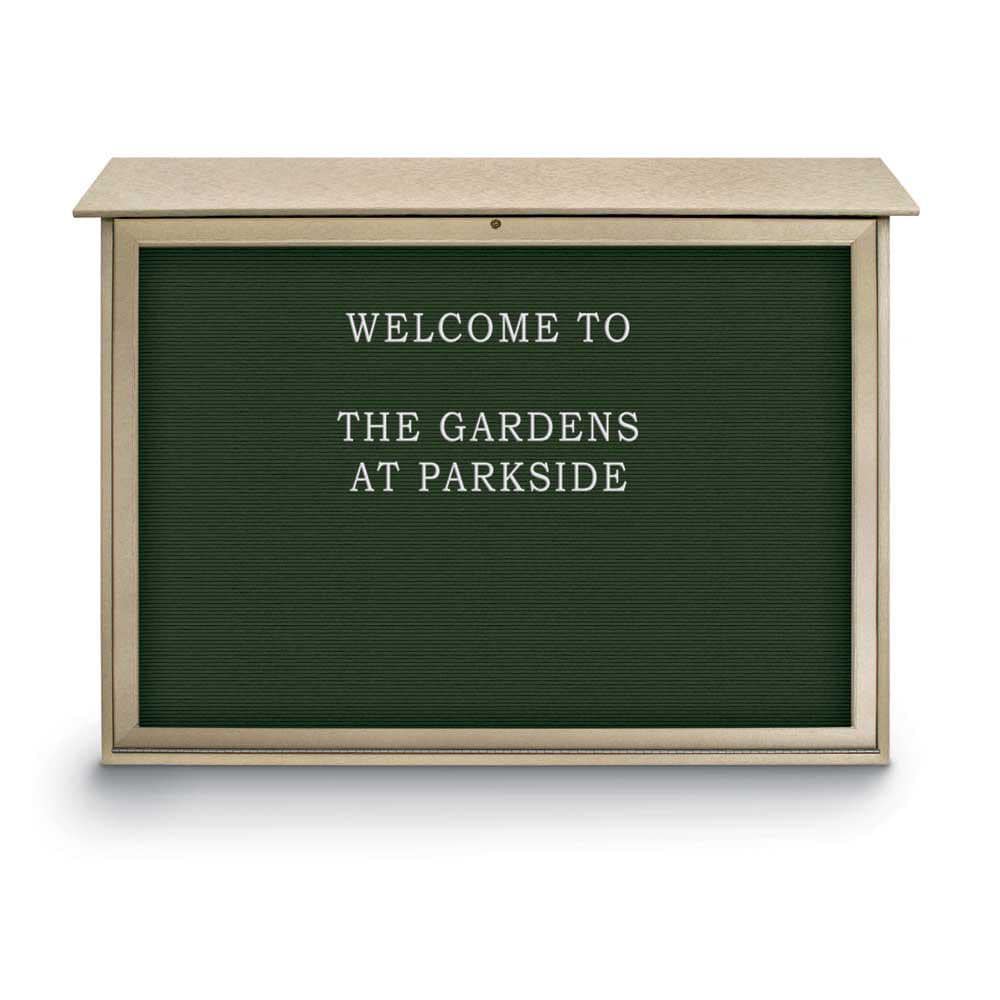 Detailed Product Description | 45" x 30" Single Door Bottom Hinged Message Center with Green Felt Letterboard & Sand Recycled Plastic Frame |