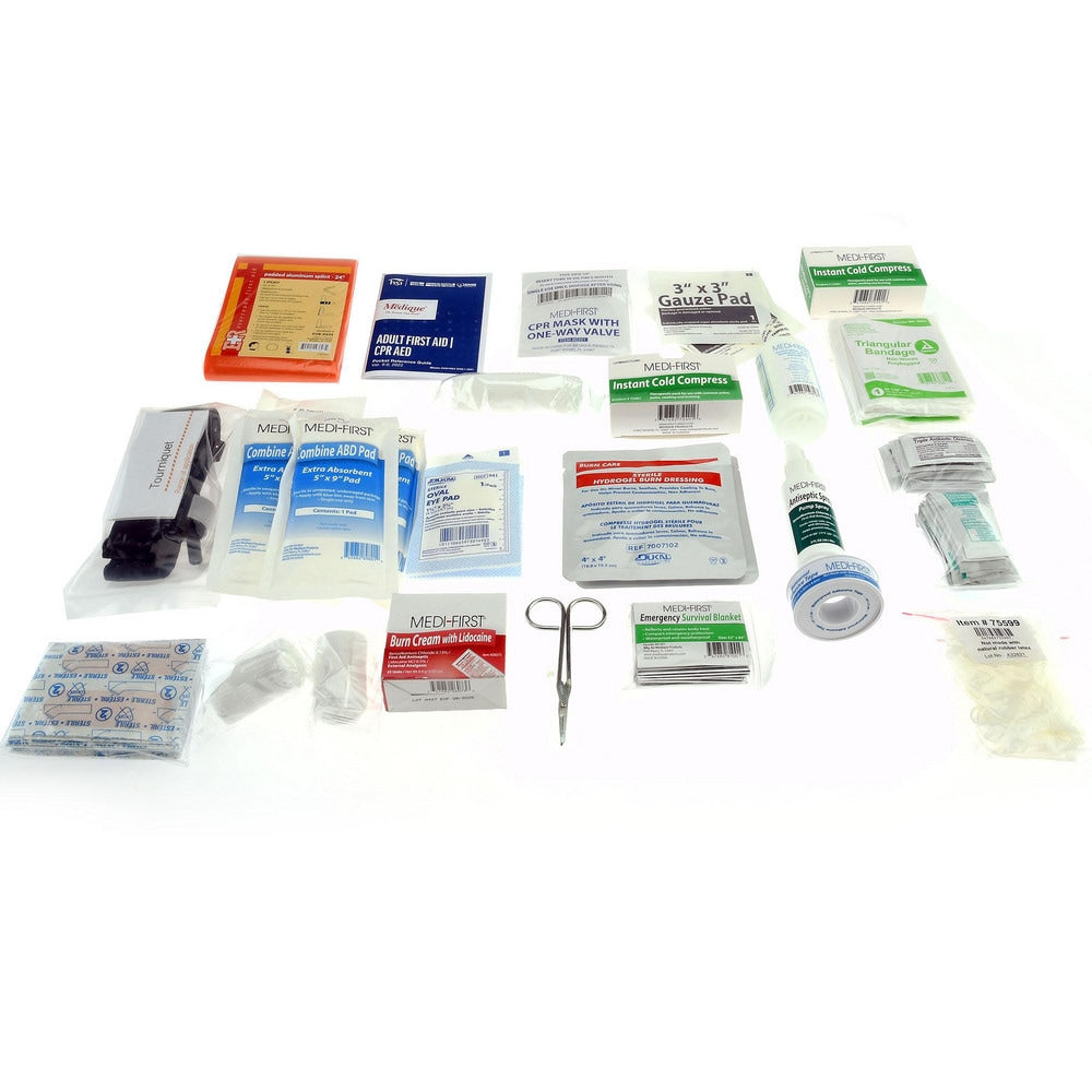 Includes | 2 - Triangular Bandage with Pins Non-Sterile; 4 - Combine ABD Pads 5 in x 9 in; 1 - Adhesive Tape 1/2 in x 5 yd; 1 - Gauze Pad 3 in x 3 in Sterile 25ct; 1 - Adhesive Bandage 1 in x 3 in Strip 50/box; 1 - Gauze Roll 4 in x 5 yd; 1 - Splint Multi-Purpose; 1 - First Aid Handbook; 1 - Hand Sanitizer 25/box; 1 - Eye Wash 4oz; 1 - CPR Mask/Breathing Barrier; 1 - Antiseptic Spray 2oz Pump; 2 - Gauze Roll 2 in x 5 yd; 2 - Burn Dressing 4 in x 4 in; 2 - Eye Pads; 1 - Triple Antibiotic Ointment 25/box; 1 - Burn Cream with Lidocaine 25/box; 1 - Rescue Blanket Silver 52 in x 84 in; 2 - Cold Pack Small Boxed; 1 - Tourniquet CAT/Windlass; 4 - Powder Free Vinyl Gloves Disposable Pair/L; 1 - Wire Scissors 4.5 in |