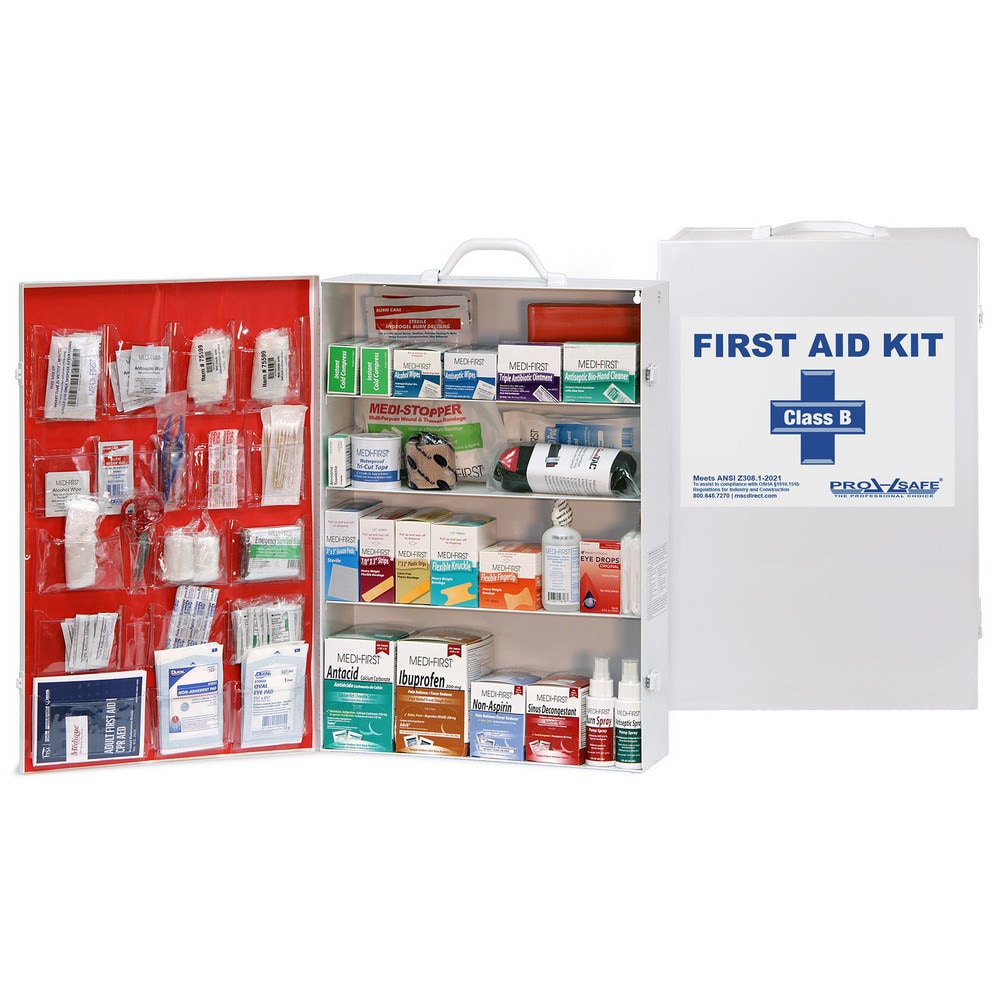 Includes | 1 - Adhesive Bandage Knuckle 40/box; 1 - Alcohol Prep Pads 50/box; 4 - Combine ABD Pads 5 in x 9 in; 1 - Splint Multi-Purpose; 1 - Ammonia Wipes 10/box; 1 - Hand Sanitizer 25/box; 1 - Eye Wash 4oz; 1 - Antacid Tablets 250/box; 1 - Antiseptic Spray 2oz Pump; 2 - Gauze Roll 2 in x 5 yd; 2 - Cotton Tip 3 in Applicator 10/bag; 1 - Tweezers Plastic Disposable; 1 - Rescue Blanket Silver 52 in x 84 in; 1 - Antiseptic Wipes-XL 20/box; 1 - Burn Spray 2oz Pump; 2 - Cold Pack Small Boxed; 1 - Adhesive Tape Tri-Cut 5 yd; 4 - Powder Free Vinyl Gloves Disposable Pair/L; 2 - Triangular Bandage with Pins Non-Sterile; 1 - Adhesive Bandage 7/8 in x 3 in Strip 50/box; 1 - Non-Aspirin Tablets 100/box; 1 - Gauze Roll 4 in x 5 yd; 10 - Non-Adherent Sterile Pads 2 in x 3 in Sterile; 1 - First Aid Handbook; 1 - Gauze Pad 3 in x 3 in Sterile 25/box; Kit fills subject to change; 1 - Scissors 4.5 in; 1 - Eye Drops Medicated 0.5oz4 - Eye Pads; 1 - CPR Mask/Breathing Barrier; 1 - Ibuprofen Tablets 250/box; 2 - Burn Dressing 4 in x 4 in; Meets ANSI Z308.1-2021; 1 - Triple Antibiotic Ointment 25/box; 1 - Burn Cream with Lidocaine 25/box; 1 - Adhesive Bandage Fingertip 40/box; 1 - Self-Adherent Wrap 2 in; 1 - Adhesive Bandage 1 in x 3 in Strip 100/box; 1 - Tourniquet CAT/Windlass; 1 - Bloodstopper Compress 9 in x 5 in; 1 - Sinus Decongestant Tablets 100/box |