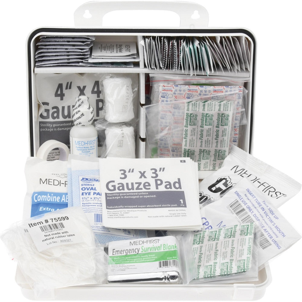 Includes | 1 - Adhesive Bandages Knuckle Woven 8ct; 12 Aspirin Tablets 2/pkt; 1 - Adhesive Bandages 1 in x 3 in Plastic Strips 16ct; 1 - Gauze Pad 3 in x 3 in Sterile 4ct; 1 - Gauze Roll 2 in x 5 yd Unit; 1 - Eye Wash 1oz; 3 - Ammonia Wipes; 2 - Eye Pads; 1 - Triple Antibiotic Ointment 10ct; 1 - Rescue Blanket Silver 52 in x 84 in; 1 - Adhesive Bandages Fingertip Woven 10ct; 1 - Wire Scissors 4.5 in; 2 - Combine ABD Pads 5 in x 9 in; 1 - Burn Dressing 4 in x 4 in; 1 - Cold Pack Small; 1 - Gauze Pad 4 in x 4 in Sterile 2ct; 1 - Tweezers Disposable; 1 - First Aid Handbook; Kit fills subject to change; 1 - Hand Sanitizer 10ct; 1 - Triangular Bandage with Pins Non-Sterile; 2 - Powder Free Vinyl Gloves Disposable Pair/L; 1 - Adhesive Tape 1/2 in x 2.5 yd; 1 - Antiseptic Wipes 10ct; 1 - CPR Mask/Breathing Barrier; 1 - Burn Cream with Lidocaine 10ct; Meets ANSI Z308.1-2021; 3 - Insect Sting Relief Wipes |